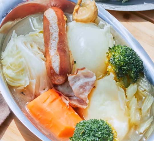 1. じゃがいも、にんじん、たまねぎは半分に切る。 キャベツは芯を落として、でもバラけないように切る。 セロリは筋を除いて3~4mm厚に切る。 2. 中火にオリーブオイルでベー …