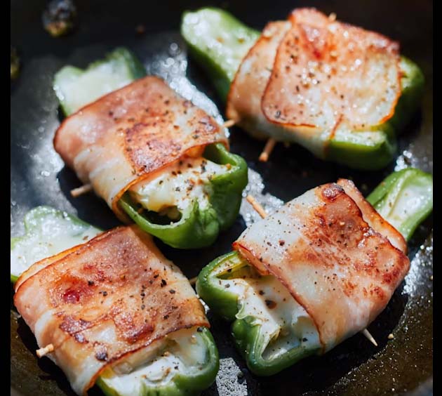■材料(4個分) ———————————————————— ・ピーマン 2個 ・カマンベールチーズ 2/3個 ・ベーコン 4枚 ・オリーブオイル 小さじ2 ・しょうゆ、黒こしょう …