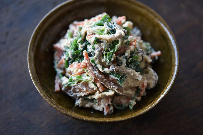 基本の「和え衣」 1. 木綿豆腐に重しをかけたり、キッチンペーパーに包んでレンジ加熱するなどして水切り 2. 水切りした豆腐を裏ごし器やざるを使って裏ごし 3. すりごま、砂糖、み …