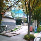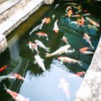 世田谷文学館の正面と、いっぱい泳いでいた錦鯉