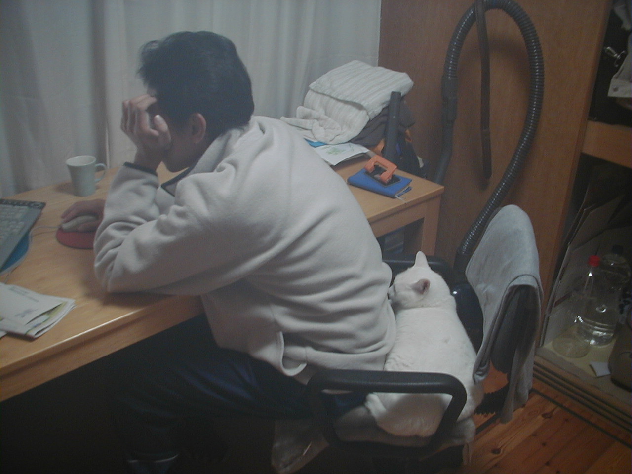 そうでなくても小さい椅子なのに どうしてそうまでして その椅子でなければ いけないのでしょうか お二人さん。 迷惑そうにしてますが あとからのったのは チャタローさんです。